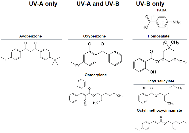 Unlike PABA and oxybenzone, avobenzone does not absorb UV-B (only UV-A), and was approved by the FDA in 1988. However, PABA being effective against UV-B, was not effective against UV-A. Oxybenzone is effective against both.