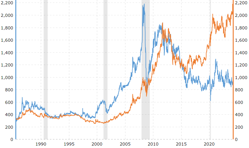 Gold and platinum prices from Aug. 12, 1985, to March 11, 2024, where gold hit a peak of $2179.47 on 3/11/2024, $2231.56 on 3/25/2024, and $2249.45 on 4/1/2024.