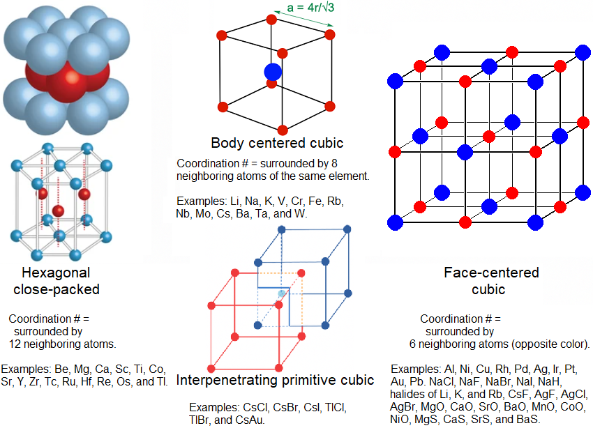 The 3 top lattice geometries in the image are obviously not the only kinds. Some geometries are so rare that only 1 known element (like Po) has it, and therefore the geometry is named after the substance. The 4th most common is known as the diamond configuration (coordination # of 4), which includes diamonds, Si, and Ge.