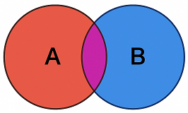 In this image, the A and B are also known as P(A) and P(B), where p stands for probability of. The shaded purple (actually magenta) is where A and B overlap, and that is called P(A ∩ B), where ∩ = intersection of. If you want to substract the magenta area, then that is P(A) + P(B) - P(A ∩ B). Disjoint is another word for mutually exclusive. P(A ∩ B) is also the same as P(B ∩ A).