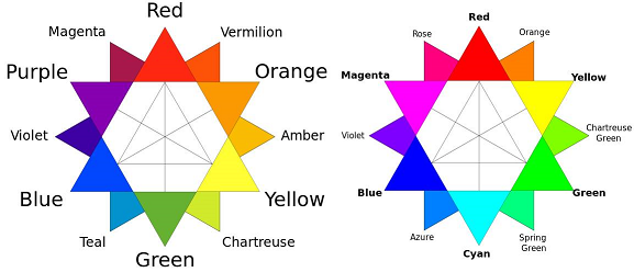 It also depends on what you mean by green. For red and blue, they are essentially the same between the paint-model of colors, and light-model of colors.