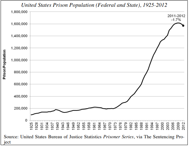 By the end of 2012, the U.S. prison population stood at 1.57 million people, constituting a 1.7% reduction from the previous year. In 2012, while 28 states reduced their prison population that year, contributing to a national reduction of 29,000 inmates, 51% (or 15,035) of that reduction was due solely to California.